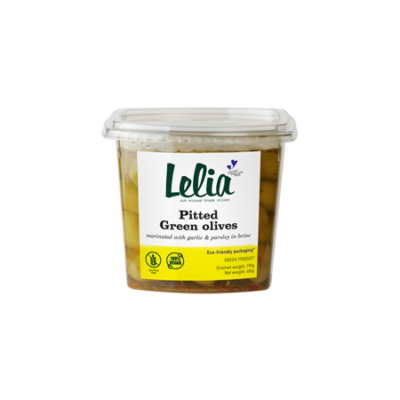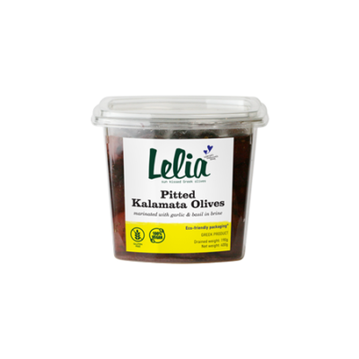 Pitted Kalamata Olives marinated with garlic and basil in brine