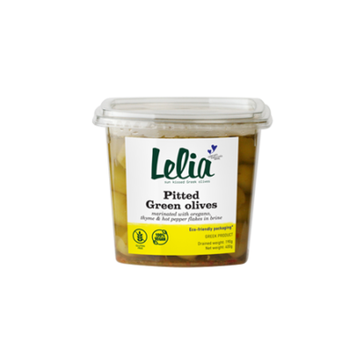 Pitted Green Olives marinated with oregano, thyme and hot pepper flakes in brine