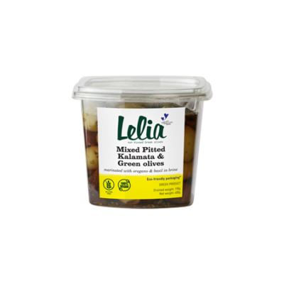 Mixed Pitted Kalamata and Green Olives marinated with oregano and basil in brine